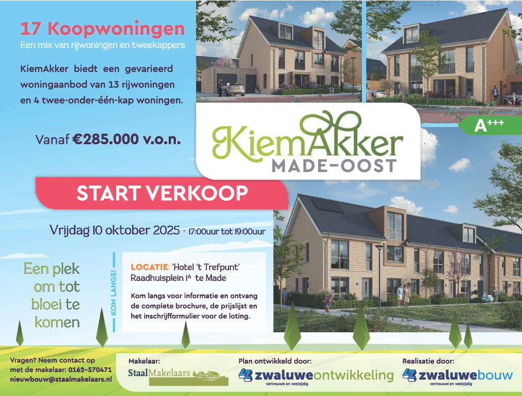 De Start Verkoop van nieuwbouwproject KiemAkker vindt plaats op vrijdag 10 oktober a.s. bij Hotel ’t Trefpunt, Raadhuisplein 1a te Made. Tussen 17.00 en 19.00 uur kun je vrijblijvend binnenlopen voor informatie over het nieuwbouwproject en het stellen van vragen. Je ontvangt dan tevens de brochure, prijslijst en het inschrijfformulier voor de loting.
